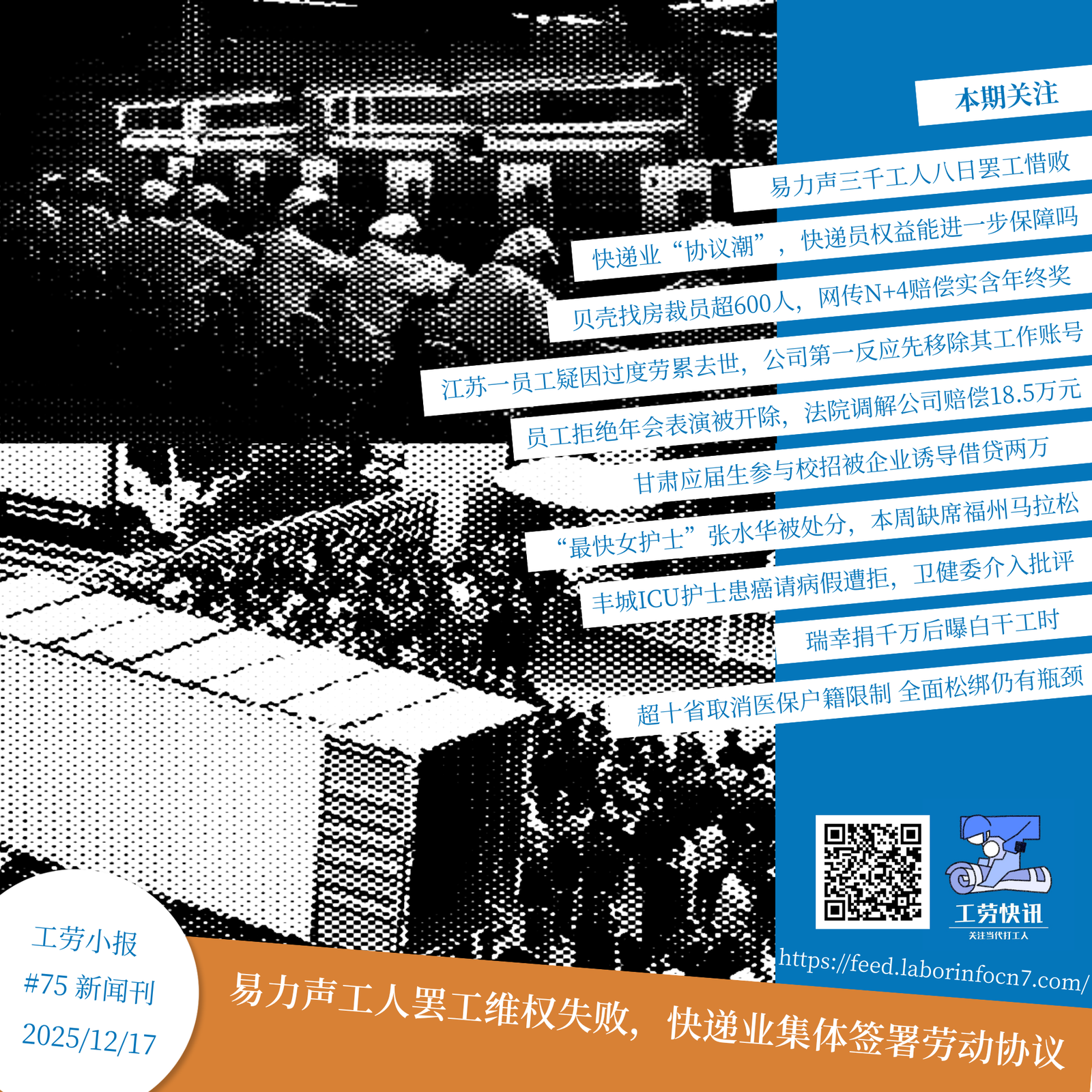 本期新闻继续按照细化分类呈现。12月4日起的易力声工人罢工引起了广泛关注,可能是2025年传播度最广的集体维权事件。“为了加班而罢工”的情况冲击了相当一部分人的“常识”,也再一次将中国基层劳动者的基本境遇传达给了大众。令人遗憾的是,即使引发了如此广泛的关注,罢工所获得的舆情支持也远称不上有力。而三千人的庞大罢工规模也没能赢取工人的权益。失败就是失败,即使有心从中寻找些许对未来的激励,也不能改变当下的冰冷。为此,本期小报的工劳推荐部分,我们准备了许多和罢工活动有关的文章,供读者朋友们了解。希望这些内容能帮助大家更深入地思考易力声罢工的失败,及其与中国劳工总体境遇的关系。